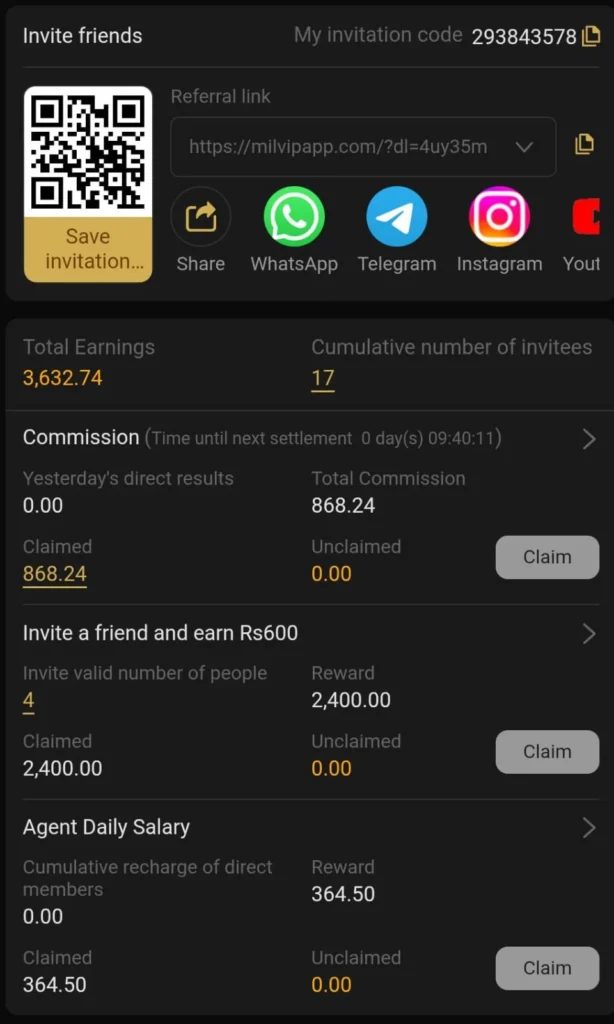 Users can invite friends to join the platform and receive referral bonuses.